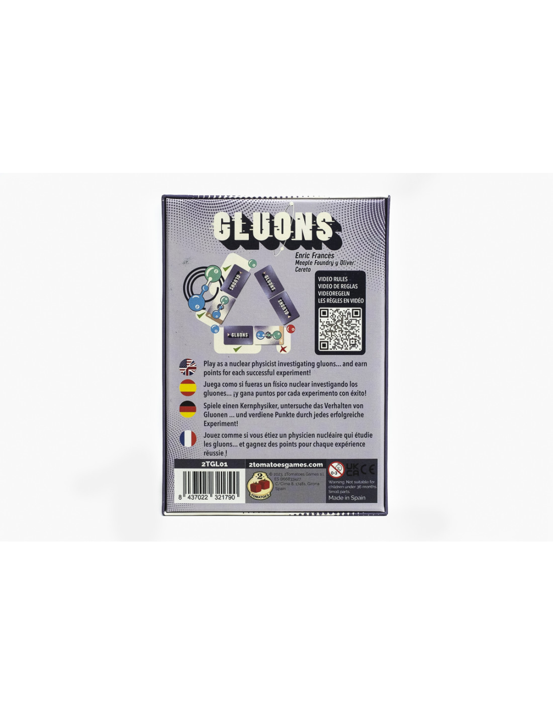 In Gluons laden wir Sie ein, in die Welt der Physik einzutauchen, zu erkunden, wie Gluonen funktionieren, und die Aufregung zu erleben, die Geheimnisse des Universums zu entdecken. Jedes Mal, wenn ein Fachmann eine effektive Interaktion zwischen Quarks erlebt, kommt er einen Schritt näher, seine Ziele zu erreichen. Gluons ist ein Spiel, bei dem die Hauptmechaniken das Bluffen und das Gedächtnis sind, obwohl es auch unerlässlich ist, Strategie und Taktik einzusetzen, um den Sieg zu erringen. Dieses aufregende Spiel dauert weniger als 15 Minuten und ist daher ein effektives Mittel, um die Konzepte der Teilchenphysik einem breiten Publikum näherzubringen.