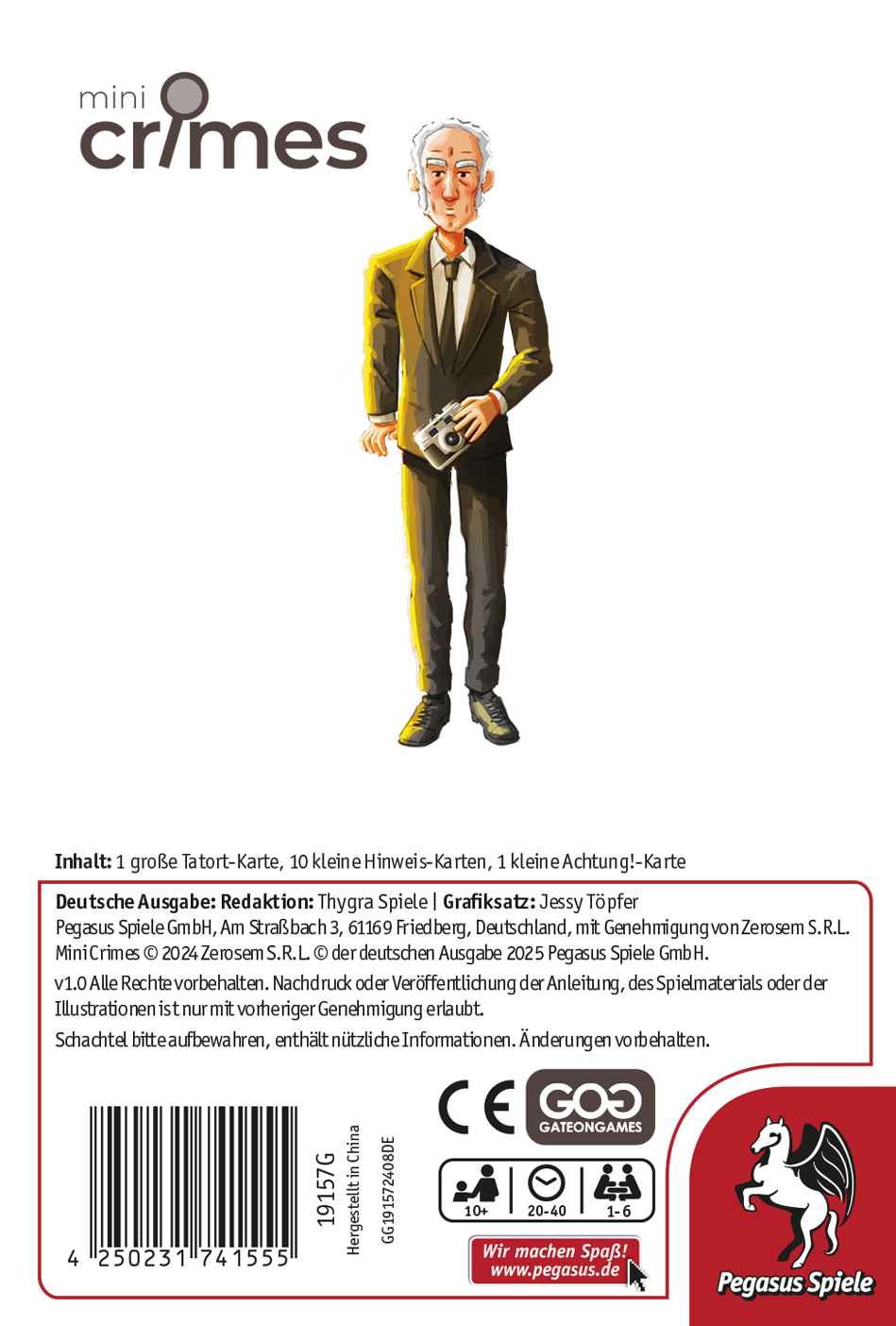 Die MiniCrimes-Fälle sind kooperative Krimispiele, in denen die Spielenden ihre Beobachtungsgabe und ihre detektivischen Fähigkeiten unter Beweis stellen müssen, um einen mysteriösen Fall zu lösen. Sie untersuchen dabei den Tatort und bis zu 10 Hinweise, die sie mit Bedacht auswählen müssen, um das Geheimnis zu lüften!