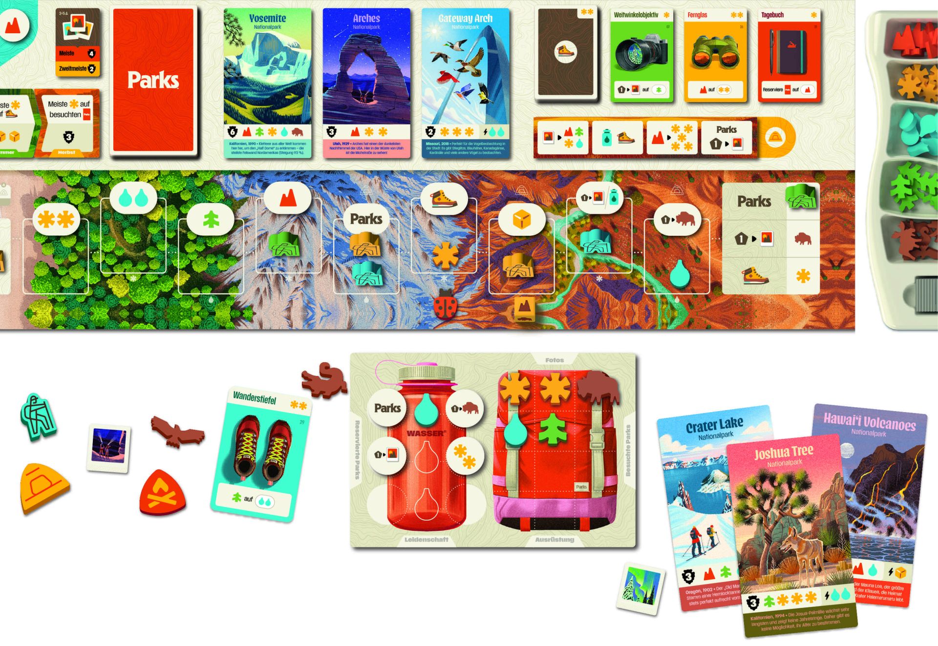Parks ist ein unglaublich schönes Spiel. Ihr versucht, möglichst viele Nationalparks der USA zu bewandern. Auf eurem Weg sammelt ihr Ressourcen und nutzt diese, um möglichst viele Eindrücke von euren Wanderrouten mitzunehmen.